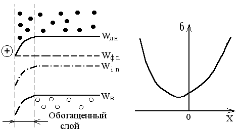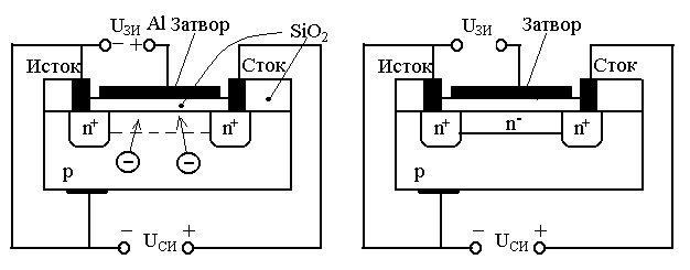 -канала. При отрицательном напряжении на затворе концентрация носителей заряда и канале уменьшится и в нем появляется обедненный слой. Сопротивление между истоком и стоком увеличивается и ток уменьшается. При положительном напряжении на затворе ток стока увеличивается, потому что в канале индуцируется дополнительный отрицательный заряд, увеличивающий его проводимость.