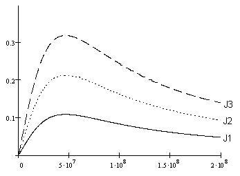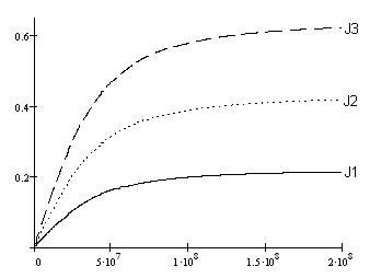 Рис. 2. Семейство зависимостей тока короткого замыкания ФМЭ от магнитного поля при малой скорости поверхностной рекомбинации при различной интенсивности света J, фотонов/м2