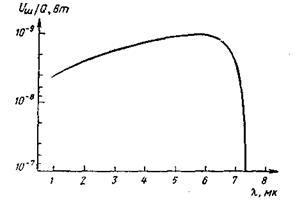 Чувствительность прибора в различных частях спектра описывается спектральной характеристикой. Спектральная чувствительность детектора из InSb иллюстрируется рис. 4. Длинноволновая граница характеристики равна 7,4 мк.