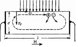 Рис. 1 Возникновение фотоэлектромагнитного эффекта в полупроводниковой пластине, где Н – напряженность магнитного поля, l – длина пластины, d – ее толщина, x1