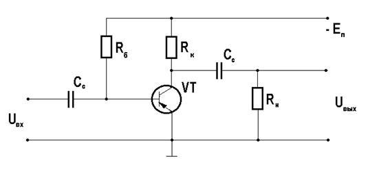 Схема включения транзистора с общим эмиттером, с фиксированным током базы, с резистивно- ёмкостной связью с нагрузкой.