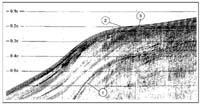 Геологическую ситуацию, благоприятную для развития оползневых явлений на склоне Камчатского каньона можно проиллюстрировать на примере фрагментов сейсмограмм (см. рис.3). В строении склонов, обрамляющих каньон, обращают на себя внимание две характерные особенности. Первая - в сейсмическом изображении уверенно читаются тектонические нарушения, которые совершенно не выражены в рельефе морского дна. Вторая - наличие нескольких восстающих выклинивающихся пластов, перекрытых слоем осадков переменной мощности. К участкам выклинивания пластов и к зонам тектонических нарушений приурочены цепочки газовых просачиваний различной интенсивности, которые уверенно фиксируются на записях эхолота в виде гидроакустических аномалий. Анализ сейсмограмм свидетельствует о том, что цепочки газовых выходов маркируют зоны формирований стенок отрыва оползневых тел. Именно на указанных участках морского дна через неконсолидированные песчано-глинистые осадки проникает метан, формируя на поверхности небольшие постройки конической формы [34].