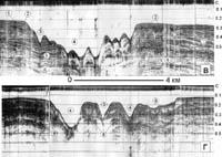 Вверх по разрезу выше упомянутого горизонта залегает слоистая разнокомпетентная толща, представленная (по данным опробования дночерпателями) глинистыми илами с текучей консистенцией и максимальной влажностью, переслаивающихся, в свою очередь, с пачками более плотных суглинков. Осадки, обрамляющие каньон, нарушены сбросообразующими разломами и трещинами отрыва, часть из которых перекрыты слоем верхнечетвертичных отложений небольшой мощности (рис.3). К трещинам отрыва приурочены газовые выходы различной интенсивности, которые уверенно фиксируются на эхолотных записях (рис.4.). Различие в гранулометрическом и вещественном составе между отдельными компонентами осадочного разреза объясняется тем, что характер материала, выносимого р.Камчатка, значительно менялся на протяжении геологического времени главным образом в зависимости от климатических условий. В период верхнеплейстоценового похолодания в пределах современного шельфа Камчатского залива были сформированы торфяники различной мощности и протяженности [6], которые при повышении уровня моря были погребены под верхнеплейстоцен-голоценовыми дельтовыми отложениями р.Камчатка.