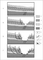 Кинематику процесса формирования и перемещения оползней в каньонах Камчатского залива моделирует блок-схема на рис.8. В строении осадочной толщи исследуемого района отчетливо проявлен генерализованный трехслойный разрез разнокомпетентных осадков (рис.8а). Верхний слой - это пачка переслаивания неконсолидированных осадков, которая формируется в режиме лавинного осадконакопления и динамически наименее стабильна [21]. Средний слой представлен горизонтами, сложенными плотными глинами (высокоамплитудная граница на сейсмограммах). Нижний слой слагает песчано-глинистая толща с высокой газонасыщенностью, которая на отдельных участках на склонах каньонов подвергается воздействию разгружающихся грунтовых вод и, следовательно, подвержена разрушению.