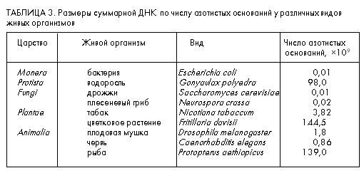 Тогда возникает другой вопрос: а каковы возможности живого организма вмещать в себя подобную информацию? Первичная информация содержится в нуклеотидной последовательности, и хотя она и очень велика, но все же не беспредельна. В табл. 3 представлены числа азотистых оснований суммарной ДНК у представителей разных царств живой природы. Первое, на что обращаешь внимание, это то, что общее их число варьирует в очень широких пределах и может составлять от 107 (некоторые бактерии и грибы) до 1011 (представители растений и рыб). При этом заметим, что царь природы человек отнюдь не является чемпионом среди других представителей живой природы, довольствуясь лишь примерно одним миллиардом азотистых оснований. Но для нас главное не это. Оказывается, самый большой геном не может вместить информацию даже о всех возможных декапептидах (n = 10) при их последовательном расположении.