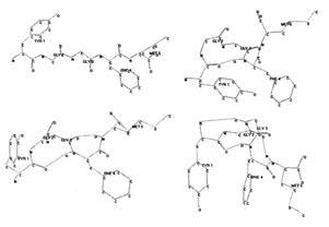 На рис. 2 показаны 4 возможные структуры природного пептидного опиоида энкефалина, состоящего из 5 аминокислотных остатков. Насколько они разные! Первая (развернутая) с большим трудом была получена с помощью рентгеноструктурного анализа. Три другие рассчитаны с применением специальных методов компьютерного моделирования, в результате чего получены структуры, содержащие от одной до трех внутримолекулярных водородных связей и очень сильно отличающиеся по конфигурации. Малость молекулы олигопептида позволяет ей в живом организме перемещаться на довольно большие расстояния, а высокая внутримолекулярная подвижность – принимать форму, необходимую для успешного взаимодействия со многими веществами, в том числе и с крупными белками (например, с рецепторами).
