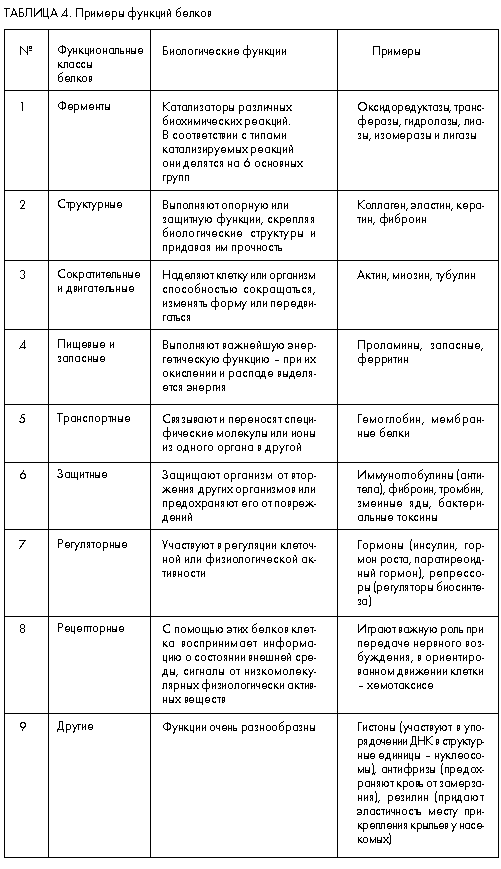 Многообразие структурных форм белков и олигопептидов лежит в основе многообразия и их биологических функций. Это многообразие обусловливает то, что единой и строгой классификации веществ пептидной природы не существует, и пока есть сомнения в том, что такую классификацию в ближайшее время можно будет создать. Поэтому представляется возможным лишь грубо и далеко неполно охарактеризовать лишь часть структурно-функциональных групп белков, что и представлено в табл. 4.