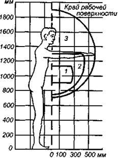 Пространство рабочего места, в котором осуществляются трудовые процессы, должно быть разделено на рабочие зоны. Зонирование рабочего места в горизонтальной и вертикальной плоскостях представлено на рис. 1, 2. Рабочую зону, удобную для действия обеих рук, нужно обязательно совмещать с зоной визуального обзора.