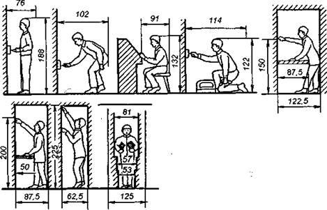 Минимальное пространство рабочего места, необходимое для выполнения работы при различных положениях тела указано на рис. 3.