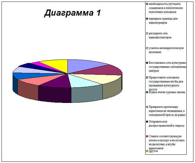На первом месте среди предлагаемых мер - необходимость улучшить социальное и политическое положение молодежи (14%). На втором месте - требование перекрыть границы для наркокурьеров (13%). На третьем месте - рекомендации расширить сеть наркодиспансеров (12%). Далее следуют предложения усилить антинаркотическую кампанию (10%). Восстановить сеть культурных государственных молодежных центров (10%). Предоставить молодежи государственные клубы для проведения культурного досуга (9%). Издать более суровые законы (8%). Прекратить пропаганду наркотиков на телевидении, в молодежной прессе, на радио (7%). Отправить всех распространителей в тюрьму (5%). Ставить соответствующую печать в паспорт и не пускать на дискотеки, в клубы наркоманов (3%), Диаграмма 1.