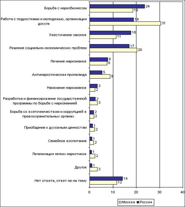 Крупнейшие федеральные программы, разработанными Госкомитетом по физической культуре и туризму, такие как "Дети России", "Молодежь России", "Патриотическое воспитание молодежи", уже вступили в силу. Основной целью программ является создание дееспособной, масштабной системы популяризации занятий физической культурой и спортом. По результатам разнообразных социологических опросов спорт не чужд большей половине населения нашей страны. Он выступает не только эффективным способом борьбы с наркоманией и юношеским алкоголизмом, что показывает Таблица 1 : опрос населения Москвы и России о способах снижения уровня наркомании среди молодежи, а также данные социологического опроса: "Что, по Вашему мнению, следует предпринимать, чтобы уберечь молодежь от употребления наркотиков?" Опрос проводился в школах, училищах и ВУЗах, и возрастная категория оценивалась от 15 до 24 лет.