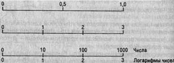 Необходимо найти логарифмы исходных чисел, начертить ординату и разделить ее на несколько равных частей. Затем нанести на ординату (или равную ей параллельную линию) отрезки, пропорциональные абсолютным приростам этих логарифмов. Далее записать соответствующие логарифмы чисел и их антилогарифмы, например (0,000; 0,3010; 0,4771; 0,6021; ...; 1,000, что дает 1, 2,