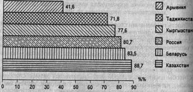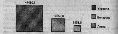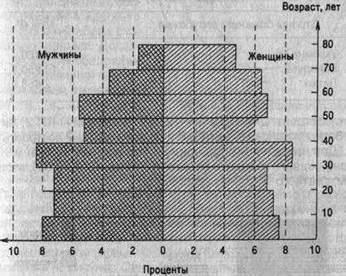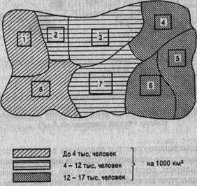 Согласно данным табл. 5.9 все районы по плотности населения можно разбить на три группы: 1) районы, имеющие плотность населения до 4 тыс. человек; 2) от 4 до 12 тыс. человек; 3) от 12 до 17 тыс. человек. Тогда к первой группе относятся районы № 1, 8; ко второй - № 2, 3, 7; к третьей - № 4, 5, 6. Если принять для каждой группы районов окраску различной насыщенности, то на фоновой картограмме хорошо видно, как располагаются на территории области отдельные районы по плотности населения (рис. 5.25). Другим примером фоновой картограммы является рис. 5.26.