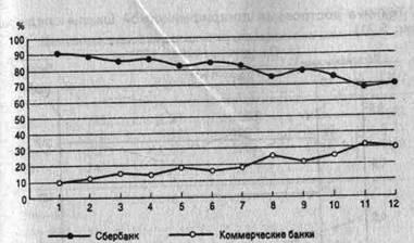 Доли вкладов граждан в Сбербанк и коммерческие банки в одном из городов в 1995 г. (%)