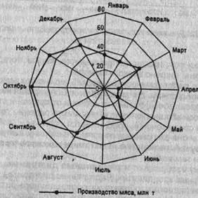 производства мяса приходится на апрель, май, затем наблюдается медленное его повышение к августу, резкий подъем в сентябре, октябре и опять спад в декабре, январе. Если же в качестве базы для отсчета взять не центр круга, а окружность, то диаграммы называются спиральными.