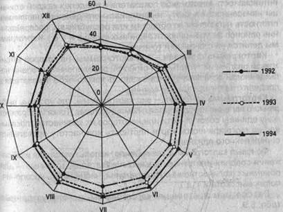 Построение замкнутых диаграмм сводится к следующему: вычерчивается круг, среднемесячный показатель приравнивается к радиусу этого круга. Затем весь круг делится на 12 радиусов, которые на графике приводятся в виде тонких линий. Каждый радиус обозначает месяц, причем расположение месяцев аналогично циферблату часов: январь - в том месте, где на часах 1, февраль - 2, и т. д. На каждом радиусе делается отметка в определенном месте согласно масштабу исходя из данных за соответствующий месяц. Если данные превышают среднемесячный уровень, отметка делается за пределами окружности на продолжении радиуса. Затем отметки различных месяцев соединяются отрезками. В приведенном примере (рис. 5.23) К = 44,8 тыс. т, длина радиуса - 3,0 см. Следовательно, 1 см = 44,8 : 3,0 " 15 тыс. т. Данная замкнутая диаграмма наглядно показывает, что производство мяса подвергнуто сезонным колебаниям. Минимум