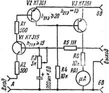 Виберемо нескладну схему для визначення емоційного стану людини, яка складається з чотирьох транзисторів, пяти резисторів постійного опору, одно резистора зі змінним опором, електролітичного конденсатору та мікроамперметра(Рис.14).