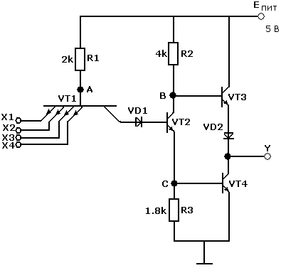 1) В качестве 4-х эмиттерного транзистора использован транзистор с геометрическими размерами 1х4 мм и расположением выводов как на рис.1.