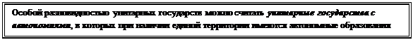 Присущая всем унитарным государствам централизация может проявляться в разных формах и в разной степени. В некоторых странах вообще отсутствуют местные органы и административно-территориальные единицы управляются назначаемыми представителями центральной власти. В других государствах местные органы создаются, но они поставлены под контроль (прямой или косвенный) центральной власти. В зависимости от того, какой вид контроля осуществляет центральная власть за местными органами, различают централизованные и децентрализованные унитарные государства. В некоторых же унитарных государствах используется предоставление более льготного правового статуса одной или нескольким административно-территориальным единицам. Такое унитарное государство характеризуется наличием административной автономии для некоторых структурных территориальных подразделений. Указанная форма государственного устройства находит применение там, где требуется учет специфических интересов территориальных единиц (национальных, этнических, географических, исторических и др.) Права по самоуправлению у автономных образований несколько шире, чем у населения обычных административно-территориальных единиц. Однако самостоятельность автономий допускается только в пределах, установленных центральной властью.1