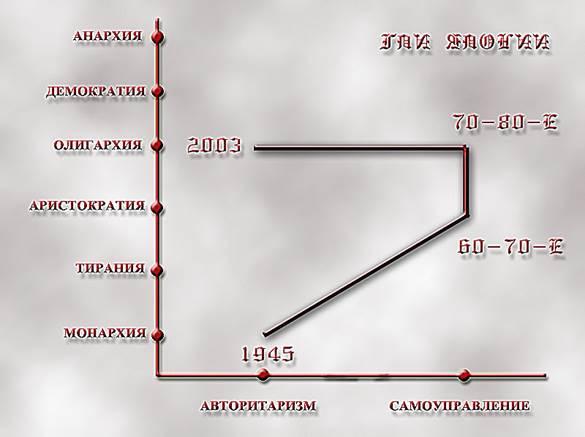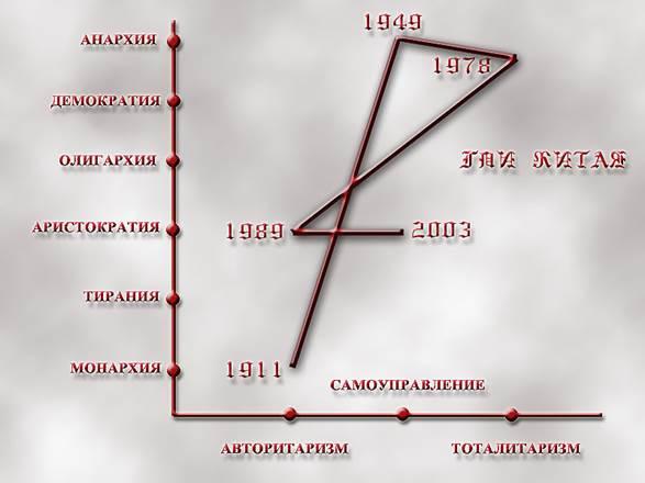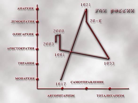 Тимократия и олигархия были историей преодолены (первая — полностью, вторая — частично), а демократический и тоталитарный режимы превратились ныне в господствующие формы. Конечно, их современное истолкование отличается от платоновского. Государствоведческая мысль XX века противопоставляет демократию как политическую форму, обеспечивающую прогресс, тоталитаризму как воплощению политической реакции, тогда как у Платона обе они суть формы вырождения "наилучшего государства". Правда, тирания (платоновский эквивалент современного тоталитарного режима), в этой градации занимает последнее место и потому страдает наибольшей вырожденностью[7]