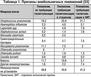 Микробиологическая идентификация возбудителя возможна лишь в 40–60% случаев всех пневмоний. Структура возбудителей внебольничных пневмоний, основанная на результатах 41–го проспективного исследования (они проводились в Европе), представлена в таблице 1 [23].