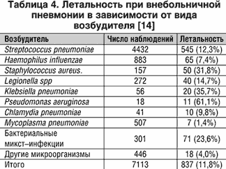 Причинный фактор также оказывает влияние на прогноз заболевания: летальность больных значительно повышена при обнаружении таких микроорганизмов как: S. pneumoniae, Legionella spp., P. aeruginosa [14] (табл. 4).