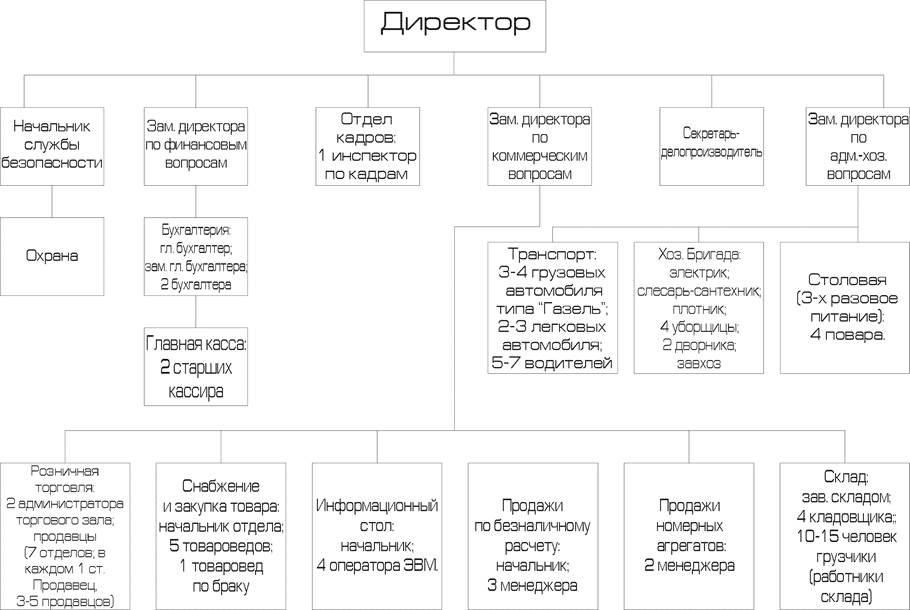 Итак, сопоставим цели конкретным элементам. За соблюдением законности и правопорядка будет следить отдел охраны. Поиском кредитов, уменьшением сроков оборачиваемости и качества бухгалтерского анализа займется финансовый отдел. Повышением квалификации сотрудников и оптимизацией кадрового состава предлагается заняться отделу кадров. Отдел коммерции должен заняться логистикой и планированием производства, его совершенствованием, прогнозированием продаж и поиском более качественной продукции. Делопроизводящий отдел предположительно займется проведением рекламных акций, а административно-хозяйственный отдел – поиском возможностей для безотходного производства. Директору предстоит поиск новых зданий, с целью снижения коммунальных платежей и арендной платы, поиском энергосберегающих технологий, расширением номенклатуры и комплекса услуг, продвижением товара в регионы.