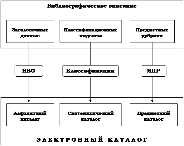 Таким образом, упрощенно можно выделить два блока данного курса: каталогизационные процессы, связанные с составлением библиографического описания (БО), в том числе с индексированием (систематизацией и предметизацией), и каталогизационные процессы, связанные с ведением и редактированием каталогов. У каждого блока есть свод основополагающих документов, регламентирующих данные виды деятельности : в первом случае это - правила каталогизаци-онного описания, язык библиографического описания (ЯБО), классификационные системы, списки предметных рубрик (язык предметных рубрик - ЯПР), тезаурусы и т.п., во втором случае это - правила оформления, ведения и редактирования каталогов.