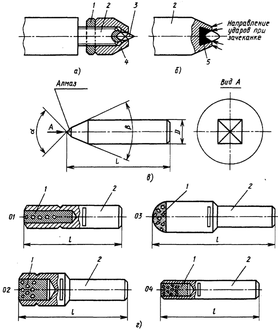 а—б—алмаз в оправе, крепление соответственно колпаком и зачеканкой; в—алмазная игла, крепление алмаза зачеканкой или пайкой; г—алмазные карандаши с расположением алмазов цепочкой (01), слоями (02), на сферической поверхности (03), с неориентированными алмазами (04)