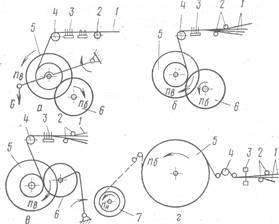 а, б, в – партионный способ (а и б – привод вала от барабана; в – привод вала от электродвигателя); г – ленточный способ.
