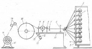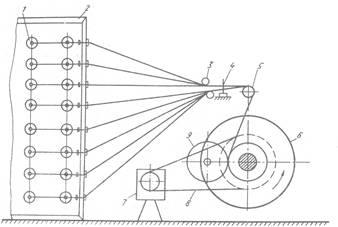 Исследования и опыт работы предприятий показали, что более распространенным является прерывный вид снования. Изучение начинают с ознакомления со схемой процесса снования.