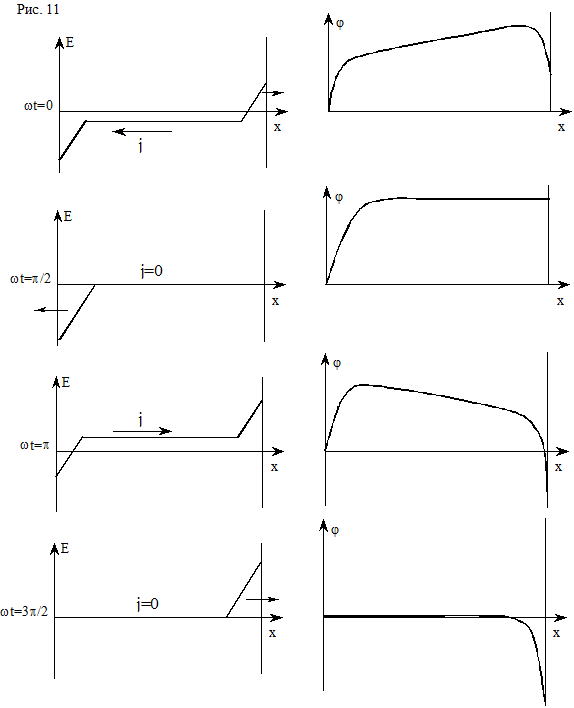 Допустим, что электроды оголены. Те электроны, которые в момент прохождения положения равновесия отстояли от электродов на расстояниях, меньших амплитуды колебаний, после первых же качаний “навсегда” уходят в металл. В состоянии равновесия с обеих сторон остаются слои нескомпенсированного ионного заряда, газ в целом оказывается заряженным положительно. При последующих качаниях электронный газ, если отвлечься от медленного диффузионного процесса, только касается электродов. На рис.10 схематично изображено качание электронного газа в предположении, что ионы совершенно  неподвижны и однородно распределены по длине промежутка, а диффузионное движение электронов отсутствует. На самом деле диффузия размывает границы между плазмой и ионными слоями. На рис. 11 построены соответствующие рис.10 распределения поля и потенциала в те же моменты времени через каждые четверть периода. Поле Е в однородной электронейтральной части промежутка постоянно по его длине. Потенциал для определённости отсчитывается от левого электрода. Можно себе представить, что он заземлён, а переменное напряжение подаётся на правый. Значение и направление электрического тока, можно считать, характеризуется напряженностью поля Е в плазме, так как чаще всего в самой плазме ток проводимости преобладает над током смещения.