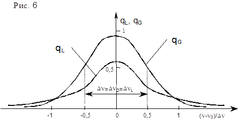 В общем случае полная ширина линии излучения определяется всеми механизмами уширения. Однако в реальной ситуации чаще всего преобладающим является один. Это вызвано различным характером зависимости и от внешних условий. Так, например, в случае газовой излучающей среды линейно растёт с концентрацией частиц, а зависит только от температуры. Поэтому при малых давлениях уширение будет определяться доплеровским эффектом, а при больших - столкновениями. Спектральное распределение излучаемой линии имеет вид симметричной резонансной кривой (рис.6) с максимумом на частоте n=n0