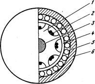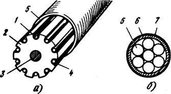 а—повивная концентрическая скрутка; б—скрутка вокруг профилированного сердечника; в—плоская конструкция; 1— волокно; 2— силовой элемент; 3— демпфирующая оболочка; 4—защитная оболочка; 5—профилированный сердечник; 6— ленты с волокнами