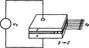 выполненный из активного материала, способного излучать световые кванты—фотоны. В качестве такого материала преимущественно используется арсенид галия с соответствующими добавками (теллура, алюминия, кремния, цинка). В зависимости от характера и количества присадок полупроводник имеет области электронной п