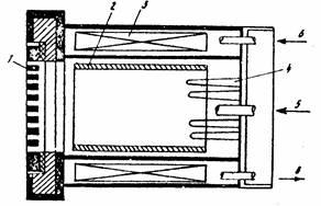 I - экстрактор, 2 - анод, 3 - электромагнит, 4 - система катодов (мультикатоды), 5 - напуск рабочего газа, 6 - водяное охлаждение.