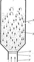 В вертикальную печь загружается глиняная крошка крупностью до 3 или 5 мм, получаемая дроблением подсушенной глины или специально приготовленных по пластическому способу и затем высушенных гранул. Через решетчатый (пористый) под печи снизу под давлением подают воздух и газообразное топливо (или же горячие газы из выносной топки). При определенной скорости подачи газов слой глиняной крошки разрыхляется, приходит в псевдоожиженное состояние, а при ее увеличении как бы кипит. Газообразное топливо сгорает непосредственно в кипящем слое. Благодаря интенсификации теплообмена в кипящем слое происходит быстрый и равномерный нагрев материала. Частицы глины обжигаются и вспучиваются примерно за 1,5 мин. Перед подачей в печь обжига глиняная крошка подогревается в кипящем слое реактора термоподготовки примерно до 300 °С, а готовый песок после обжига охлаждается в кипящем слое холодильного устройства. Насыпная плотность получаемого керамзитового песка— 500—700 кг/м3. К зерновому составу керамзитового песка предъявляются требования, аналогичные требованиям к природному песку, но крупных фракций в нем должно быть больше.