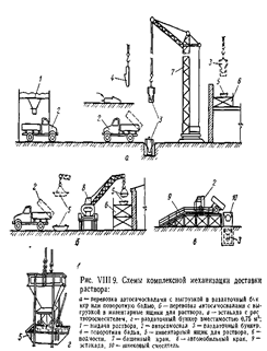 При централизованной доставке готового раствора используют автосамосвалы общего назначения (с дооборудованными кузовами для сокращения потерь) или специальные авторастворовозы с барабаном, имеющим механическое смесительное устройство внутри и допускающим порционную выдачу материала. Доставленный на объект раствор выгружают в раздаточный бункер или поворотную бадью, подают краном на рабочие места каменщиков и там выгружают в растворные ящики (рис. VIII. 9,а,г).
