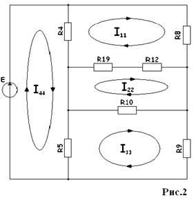преобразуем выделенную часть схемы рис.1 (только те ветви, на которых находятся вышеуказанные резисторы) в эквивалентную (рис.2). Рассчитываем токи в контурах эквивалентной схемы рис.2 методом контурных токов.