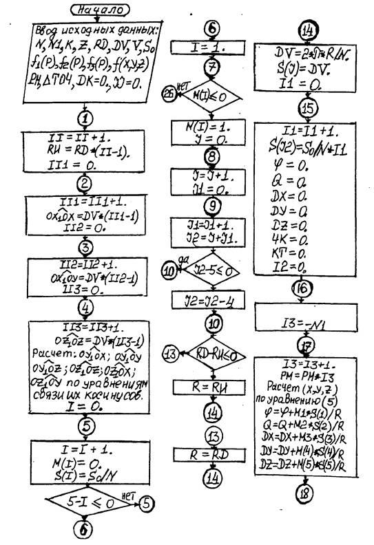 б) Если радиус инструмента Ru=/0, а его кромки представлена линией окружности и при этом на печать выводится условие Б=/(V); А=f(V), то из этого следует, что схема формообразования соответствует точению, а инструмент. ротационный резец. В противном случае: Б=f(V), А=f (S - движения подачи). Процесс соответствует фрезерованию, а инструмент - фреза, что также предусмотрено алгоритмом.