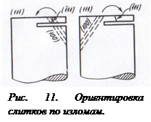 Суть метода заключается в следующем. После ориентировки слитка по плоскости (111) отрезают «горбушку», а затем параллельно плоскости (111) надрезают слиток примерно до середины диаметра. В надрез вставляют металлическую пластину и, нажимая острием из твердого сплава в точку, отстоящую на расстоянии, равном половине радиуса слитка от начала надреза, производят скол надрезанной пластины. Направление скола для таких материалов, как германий и кремний, в точности совпадает с одним из направлений [110], а плоскостью скола является одна из боковых плоскостей системы (111). Плоскость скола составляет угол, равный углу 70°32´ с торцом слитка. Далее определяют положение плоскости скола (рис. 11). Для выведения плоскостей системы (100) разворачивают слиток относительно оси, совпадающей с линией скола на угол 54°44', в направлении, показанном стрелками на рис. 11. Отрезав «горбушку», определяют правильность ориентировки, измеряя отклонение от угла θ для плоскости (100) методом, рассмотренным выше.