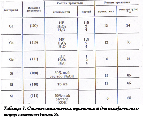 До процесса ориентации выявляют микроструктуру слитка. Это осуществляют путем травления шлифованного торца Ge (или Si) слитка селективными травителями, состав, которых приведен в табл.1. Точность ориентации этим методом зависит от состава травителя и режима травления; от диаметра, расходимости и яркости светового пучка и других факторов.