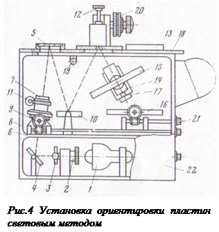 Слитки германия и кремния устанавливают в специальные сменные зажимные устройства, которые закрепляют в пазу кристаллодержателя. В одно зажимное устройство вставляют слиток полупроводникаи легко его прижимают. Световую фигуру на вертикальную ось шкалыэкранавыводят поворотом легко прижатого рукой слиткавокругоси.Затем слитококончательнозакрепляют, прижимаяк базировочной плоскости. Световую фигуру в перекрестие осей шкалы экрана выводят, вращая ручки угломерной головки. Указатель, закрепленный на ручке, показывает на шкале (лимбе) отклонение кристаллографической плоскости слитка от его геометрической плоскости. Определив отклонение, зажимное устройство освобождают от связей с угломерной головкой, слиток вынимают из паза кристаллодержателя и приклеивают к столику зажимного устройства.