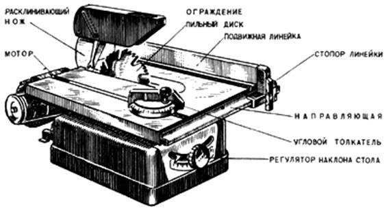 Циркулярная или дисковая пила состоит из станины с электродвигателем и шпинделя, на котором закрепляются пильные диски различного диаметра, толщины и с различной формой зубьев в зависимости от характера распиловки. Необходимым приспособлением является также подвижная линейка, которая устанавливается на нужном расстоянии от плоскости пильного диска и обеспечивает прямолинейность распиловки.