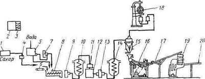 На рис. 1 приведена аппаратурно-технологическая схема по-. точно-механизированной линии для производства завернутой карамели с фруктовой начинкой. Линия работает следующим образом. Сахар из сборника 1 через просеиватель 4