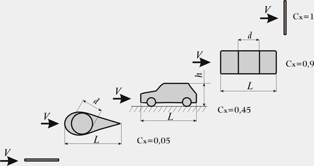 На рисунке сравниваются тела с одинаковым отношением длины к высоте l//h или длины к диаметру l//d (это отношение иногда называют коэффициентом полноты тела); фактор близости основания (т.е. поверхности дороги) при таком рассмотрении может не учитываться.