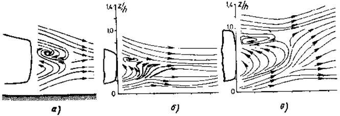 ~0,9) является в основном сопротивлением давления, в чистой форме этот вид сопротивления имеет место при обтекании плоской пластины, расположенной поперечно к потоку. Но даже в этом простом случае - простом в смысле того, что место отрыва однозначно определено острыми кромками - сопротивление давления в интересующем нас случае турбулентного потока в вихревом следе за пластиной не подается расчету. Обратное действие области возмущенного потока, в которой существенно влияние трения, на идеальный, не обладающий вязкостью внешний поток гораздо сильнее, чем в случае пограничного слоя. Общепризнанной модели для вихревого следа за телом, несмотря на интенсивные работы по ее созданию, до сих пор нет. Итеративное рассмотрение идеального, не обладающего вязкостью, а затем реального, обладающего вязкостью, потока - как в случае пограничного слоя - невозможно. Решение полных уравнений движения, так называемых уравнений Навье-Стокса, возможно только для ламинарного потока, когда закон изменения касательных напряжений известен; в случае турбулентного потока из-за отсутствия подходящего закона изменения касательных напряжений, не говоря уже о проблемах вычисления, такого решения нет.