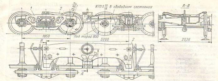 типа ЦНИИ-ХЗ-О, связанных соединительной балкой 2. Эта балка снизу по концам имеет пятники и скользуны, которымиона опирается на подпятники и скользуны надрессорных балокдвухосных тележек. Сверху в средней части соединительной балки расположены подпятник диаметром 450мм, на который опирается пятник рамы кузова, и скользуны, поддерживающие кузов при действии боковых сил.