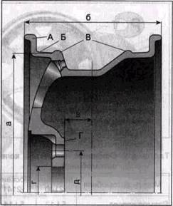 А — закраина обода; Б — полка; В — кольцевой выступ («хамп») для дополнительной фиксации бортов бескамерной шины; Г — плоскость крепления; а — монтажный диаметр; б — ширина обода; в — выпет (расстояние между плоскостью симметрии обода и крепежной плоскостью колеса); г — диаметр центрального отверстия под ступицу; д — диаметр окружности расположения крепежных болтов (шпилек)