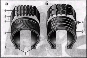 конструкции. Поперечные разрезы диагональных и радиальных покрышек показаны на рис.5.